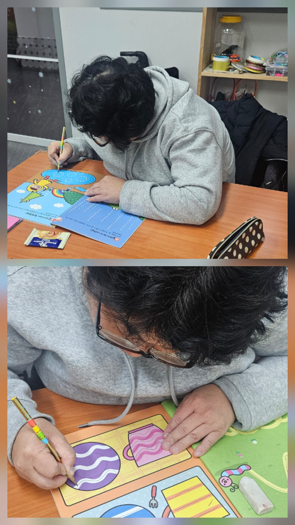 스트레칭을 시작으로 요가밴드를 이용해서 상체를 풀어주는 운동을 해보았습니다. 원래는 스티로폼 블럭에 두 무릎을 올리고 해야되는데 하체 근력이 약한 우리 이용자분은 블럭없이 무릎을 꿇은채로 상체를 움직여줬어요. 어댑핏 이후 남은 시간에는 소근육과 인지능력향상을 위해 선긋기 시간을 가져보았답니다. 직선을 바르게 긋는것과 곡선을 부드럽게 긋는것이 조금 어려워서 긴장이 된다고 말씀하셨어요. 함께 손을 잡고 그려보기도하고 이쁘게 선을 완성할 땐 폭풍 칭찬을 해드리니 점점 긴장을 풀고 더 잘하셨답니다!