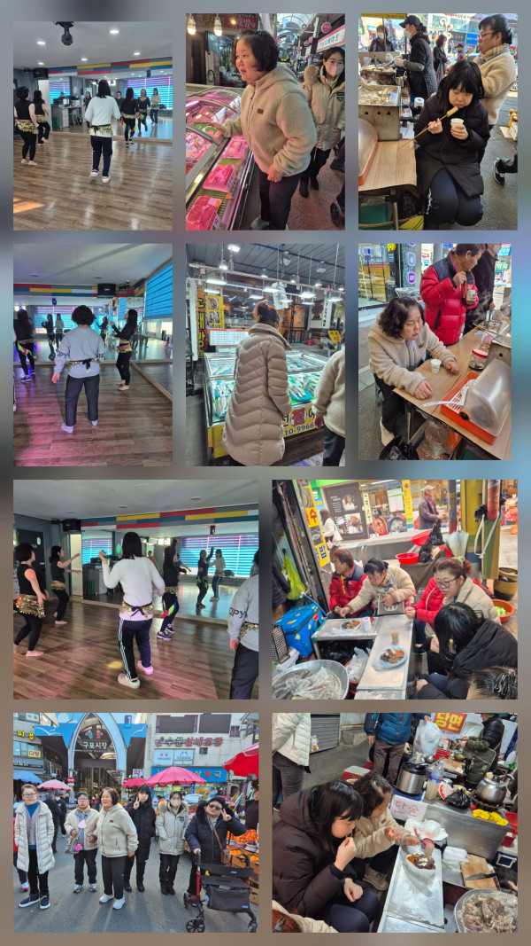 2025.12.30(화)주간활동서비스 1그룹 활동진행 페이지 정보 조회 : 3회 작성일 25-12-30 17:39 SNS 공유 : 본문 벨리댄스 수업 참여하여 유연성 기르기와 신체 노래에 맞춰 움직이며 활동하고 오후 구포시장 구경하며 길거리 간식도 사서 먹어보았어요 이전글2025. 12.30(화)주간활동서비스 4그룹 활동진행 25.12.30 다음글2025.12.30(수) 주간활동서비스 2그룹 활동진행 25.12.30 목록