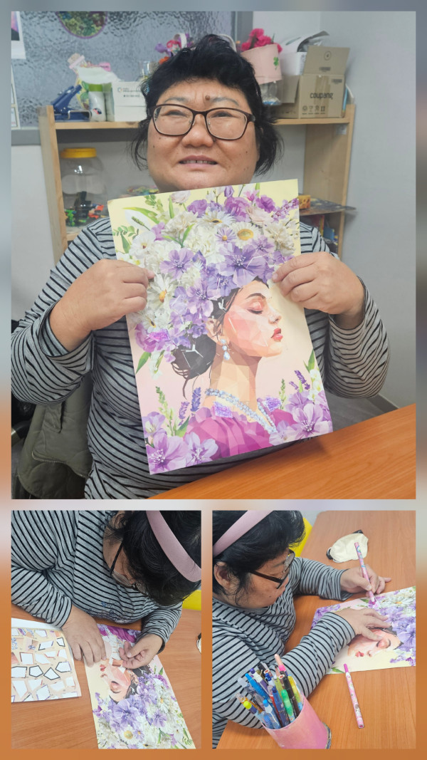 하나씩 꾸준히 해오던 스티커모자이크를 오늘 완성하는 시간을 가졌습니다. 두자리 수 읽는 것을 어려워하는 이용자분에게 차근차근 따라해보도록 알려주고 도형모형을 잘 붙일 수 있는 방법도 알려주어 멋진 그림을 완성했습니다. 힘들다고 못하겠다고 하던 이용자는 점점 완성되어가는 그림을 보며 의지를 불태웠고 결국 성공하며 뿌듯해하였어요. 다끝난 뒤 숨은그림 찾기도하며 잘 찾아내는 모습을 보였답니다.