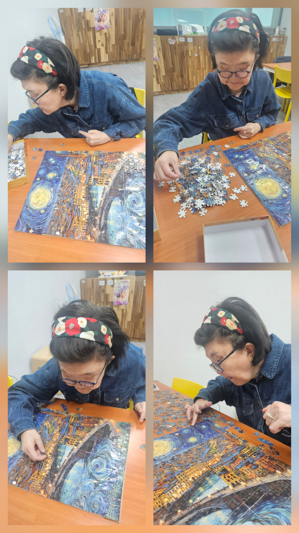 다른 이용자는 500피스 퍼즐 맞추기에 열심이었는데요, 퍼즐테두리를 다 맞추고 안을 맞추겠다며 테두리를 이어 맞췄습니다. 액자프레임을 그림위에 대어주니 기대감에 더 속도를 내었어요:)