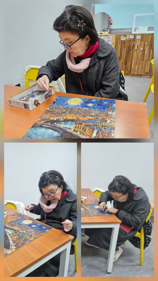 주말을 보내고 활기차게 센터에 도착한 이용자분들은 오전시간 스티커모자이크와 퍼즐맞추기를 하였습니다. 한번 완성을 해본 탓인지 더 꼼꼼하게 번호를 찾고 도형을 맞추는 모습이었어요. 퍼즐을 맞추는 이용자분도 이제 거의 남은 조각이 얼마 되지않은 상황이라 더 집중을 하는 모습을 보였습니다.