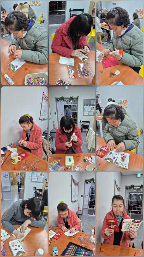 2025.12.22(월) 주간활동서비스 1그룹 활동진행 페이지 정보 조회 : 19회 작성일 25-12-22 16:59 SNS 공유 : 본문 크리스마스 카드 만들기하고 카드를 받을 사람을 생각하며 글도 적어넣었어요 오후 보링장에서 게임을 함께 즐기며 여가시간 즐겼어요 이전글2025.12.22(월) 주간활동서비스 2그룹 활동진행 25.12.22 다음글2025.12.22.(월)주간활동서비스 5그룹 활동진행 25.12.22 목록