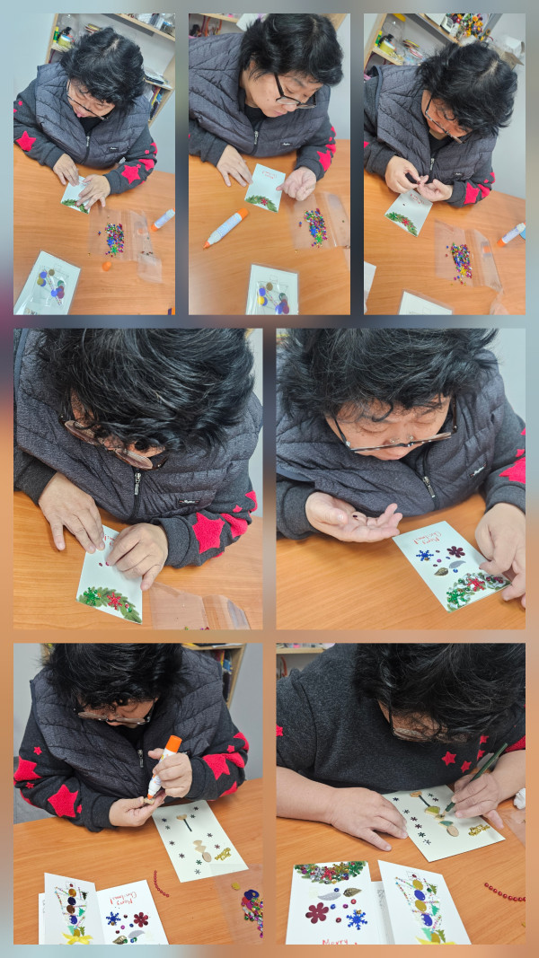 이번주 목요일 크리스마스를 생각하며 나만의 크리스마스 카드 만들기를 해보았습니다. 보석스티커와 반짝이를 카드에 그려져있는 트리와 리스에 붙이며 꾸며주었어요. 멋지게 완성된 카드는 활동지원사 선생님과 센터장님께 써서 오늘 전달해드렸답니다~ 한자한자 정성다해 눌러쓴 글씨에 이용자분의 사랑도 가득담았어요! 카드를 받고 고맙다는 이야기를 듣는 이용자분의 얼굴에도 행복한 웃음꽃이 피었답니다~