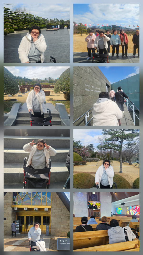 오전은 실내에서 보석십자수를 했습니다. 활동을 하며 요즘 고민이되는 여러 이야기들도 나누었어요. 당장 해결되지 않아도 이러한 고민을 서로 주고받으며 감정을 공유하고 위로하고 위로받는 시간이 되었답니다. 점심을 먹고 포근해진 오후 유엔공원으로 활동을 나가보았어요. 유엔공원은 6.25전쟁에서 싸웠던 유엔군장병이 바친 봉사와 희생을 찬양하기 위하여 설치된 기념공원으로 무덤마다 고인의 기록을 담은 묘비가 놓여있어요. 이분들의 희생덕에 평안한 오늘이 있음을 기억해야 할 것 같습니다! 오늘도 행복한 하루 보내었어요~:)