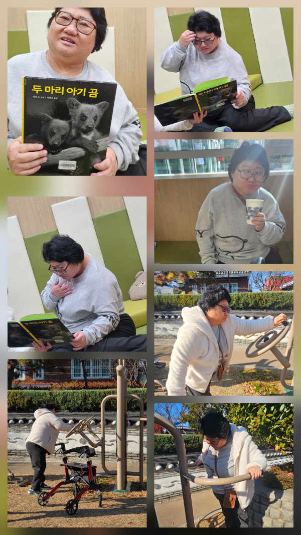 오전 모라1동 행정복지센터 내의 작은 도서관을 방문하여 책을 읽고 티타임을 가졌습니다. 우리 이용자가 읽은 책은 '두마리 아기곰'이라는 책이었는데요, 엄마곰의 신신당부에도 오누이 아기곰이 집밖을 나가 길을 잃고 헤메게 되는 내용이예요. 다행이도 마지막은 까마귀가 엄마곰에게 아기곰들의 위치를 말해주어 아기곰들을 찾게 되었습니다. 중간중간 아기곰들의 일탈을 그림으로 귀엽게 나타냈으나 까마귀가 아니었으면 이 아기곰들은 어떻게 되었을지 궁금하기도 했고 엄마곰을 찾아 다행이란 생각도 들었답니다. 추운날씨라 따뜻한 율무차로 몸을 녹인뒤 고동바위공원에서 운동하고 돌아왔어요~!