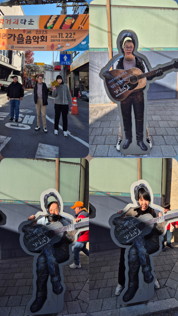 2025.11.21(금)주간활동서비스 1그룹 활동진행 페이지 정보 조회 : 1회 작성일 25-11-21 23:50 SNS 공유 : 본문 오전 벨리댄스 수업하며 신나는 음악에 맞추어 신체 움직이며 유연성 기르기와 근력운동하고 오후 김광서거리 방문하여 산책하며 다양한 포토존에서 사진도 찍었어요 다음글2025.11.21(금) 주간활동서비스 2그룹 활동진행 25.11.21 목록
