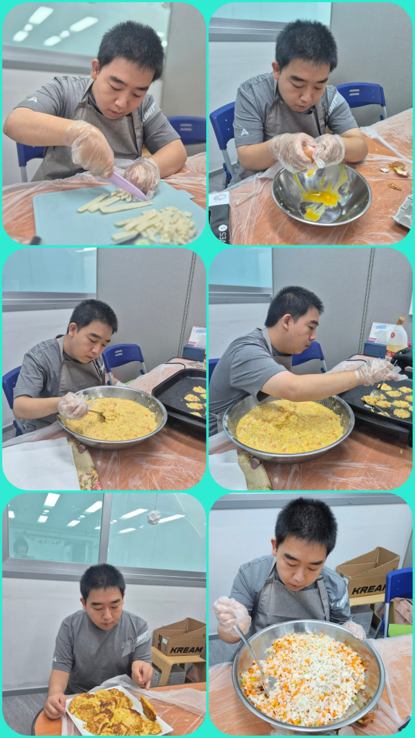 오전에는 어묵 전 만들기를 하였습니다.어묵을 잘게 자르고 다진 야채를 계란과 섞어서 전을 만들었습니다.