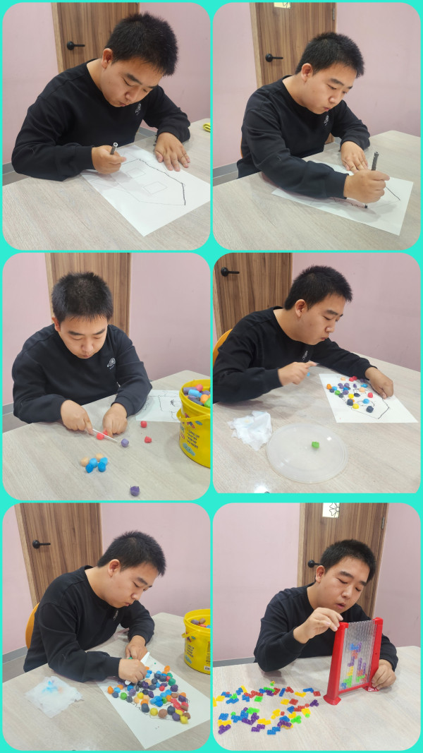 라포 형성, 흥미 유발, 소 근육, 양손 협응을 위해 훈련을 하였습니다.
