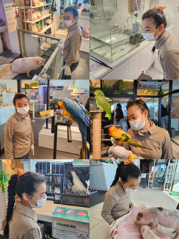 세븐테마카페에서 아기돼지, 앵무새 등의 동물들을 만나고 왔습니다