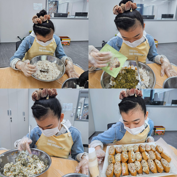 만드는 중간중간 유부초밥을 반으로 잘라 입에 넣어주니 행복한 표정으로 맛있게 먹었습니다