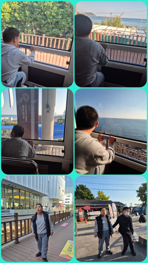 오후에는 송정 해변 열차를 탔습니다. 창들에 손을 대고 몸을 좌우로 흔드는 즐거운 모습도 보았습니다.