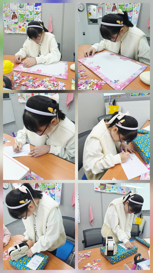 대형퍼즐맞추기 활동 후 생일선물 포장과 카드쓰기 활동하였습니다.