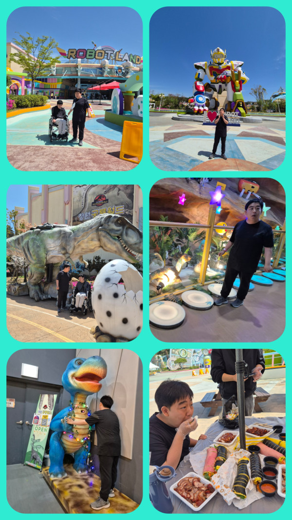 2026.4.15.(수) 최중증통합돌봄서비스 3그룹 활동진행 페이지 정보 조회 : 22회 작성일 26-04-15 17:27 SNS 공유 : 본문 로봇랜드를 다녀왔습니다.오전에는 공룡 월드에서 다양한 공룡을 구경하였고 식사 후에는 여러가지 놀이 기구를 타고 여러 종류의 로봇도 보았습니다. 이전글2026. 4. 15.(수) 최중증통합돌봄서비스 5그룹 활동진행 26.04.15 다음글2026.4.15.(수) 최중증통합돌봄서비스 4그룹 활동진행 26.04.15 목록