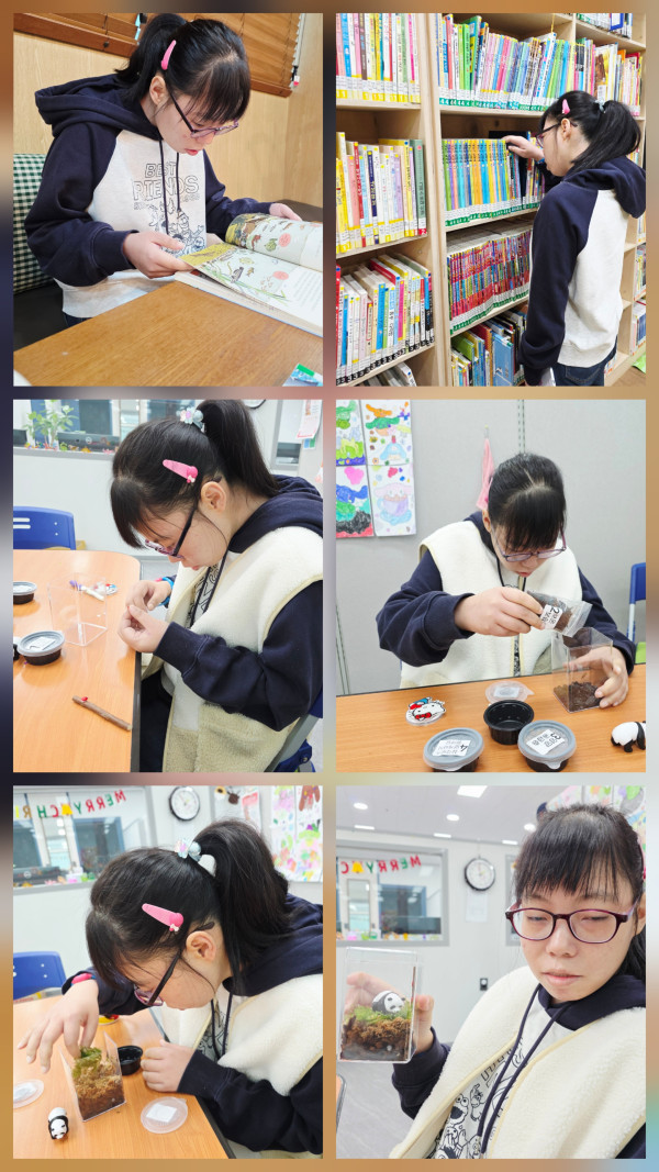 판다테라리움을 만들어서 좋아하는 사람에게 직접 선물을 하고 작은도서관에서 그림책 읽기 활동했습니다.