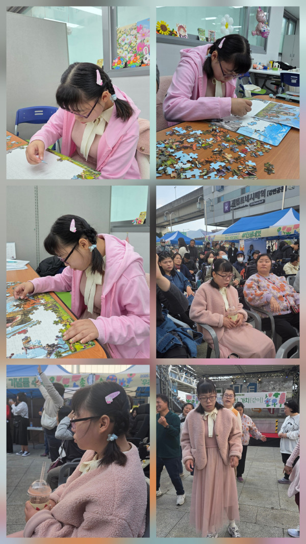 2025.11.7.(금) 최중증통합돌봄서비스 4그룹 활동진행 페이지 정보 조회 : 35회 작성일 25-11-07 17:05 SNS 공유 : 본문 오전활동 공룡퍼즐맞추기 활동했습니다. 오후활동 장애인자립생활축제 다녀왔습니다. 이전글2025. 11. 7. (금) 최중증통합돌봄서비스 5그룹 활동진행 25.11.07 다음글2025. 11. 7.(금) 최중증통합돌봄서비스 1그룹 활동진행 25.11.07 목록