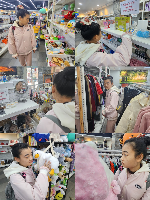 굿윌스토어에서 여러 물건들을 둘러보고 만져보며