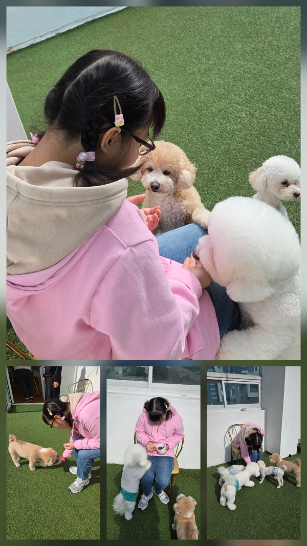 유기견 강아지카페 방문하여 강아지들과 교감하며 먹이주기 활동 진행했습니다