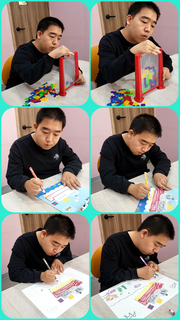 오전에는 심리 치료 센터를 다녀왔습니다. 소 근육, 양손 협응, 손끝 떨림 조절,주의력, 형태 인식하기를 훈련하였습니다.